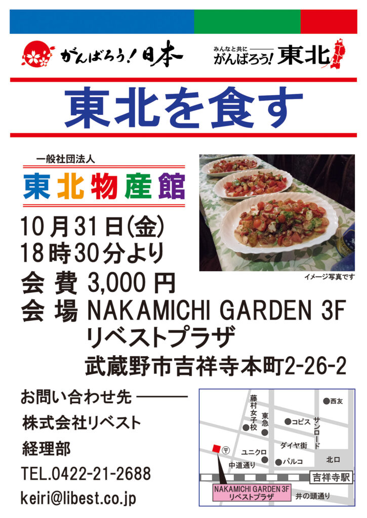 様々な会場で実施してきました「東北を食す」を今回は中道通りに新設した「NAKAMICHI GARDEN」の3階、「リベストプラザ」で開催いたします。東北物産館で取り扱っている商品などを使用した料理や、東北地方の飲み物やお酒を一緒に食しませんか? ご参加をご希望される方は下記のお問い合わせまでご連絡ください。