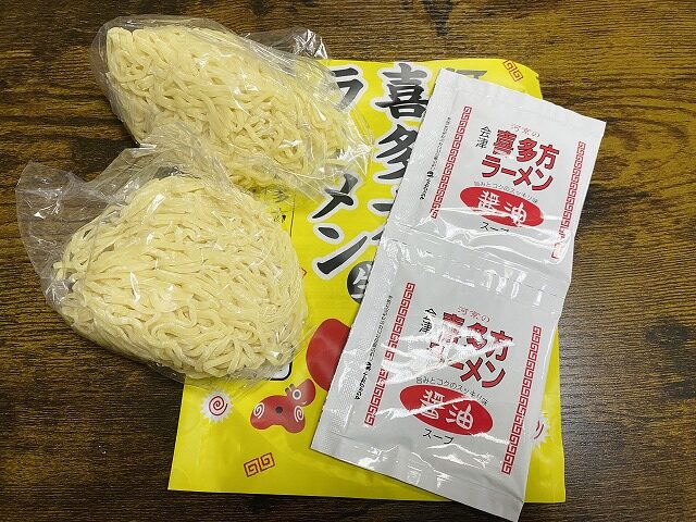 開封しました。麺と液体スープが2つずつの2人前が入っています。ガッツリ食べたいときは2人前を茹でてしまいそうです。