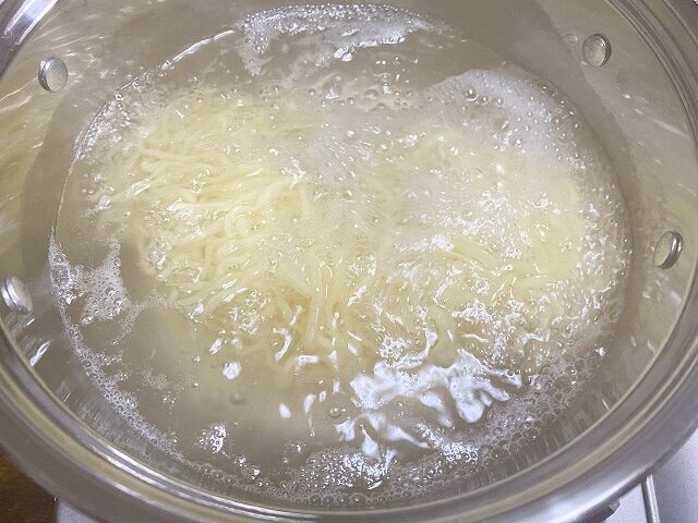 沸騰したので麺を投入しました。パッケージ裏面の作りかたに3分30秒茹でると記載されています。ほぐしながらスープの用意をします。