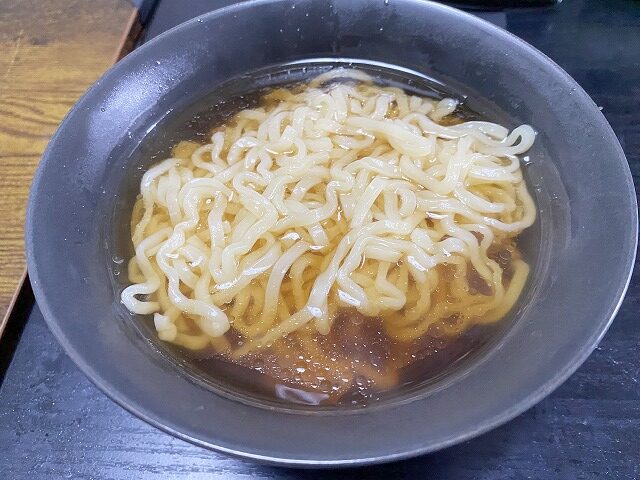 茹で上がった麺を湯ぎりしまして、スープに投入しました。「河京の喜多方ラーメン スッキリ醤油味」の素ラーメンの完成です。ここからトッピングしていきます。
