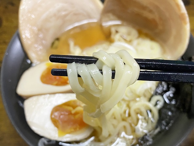 あっさりと濃厚の中間ほどのスープです。細いちぢれ麺とは違い、太くしっかりした麺で食べごたえがあります。ちょうど中間ほどの濃さのスープでクセも無く、スルスル進んであっという間に完食してしまいました。大変美味しかったです。ごちそうさまでした。